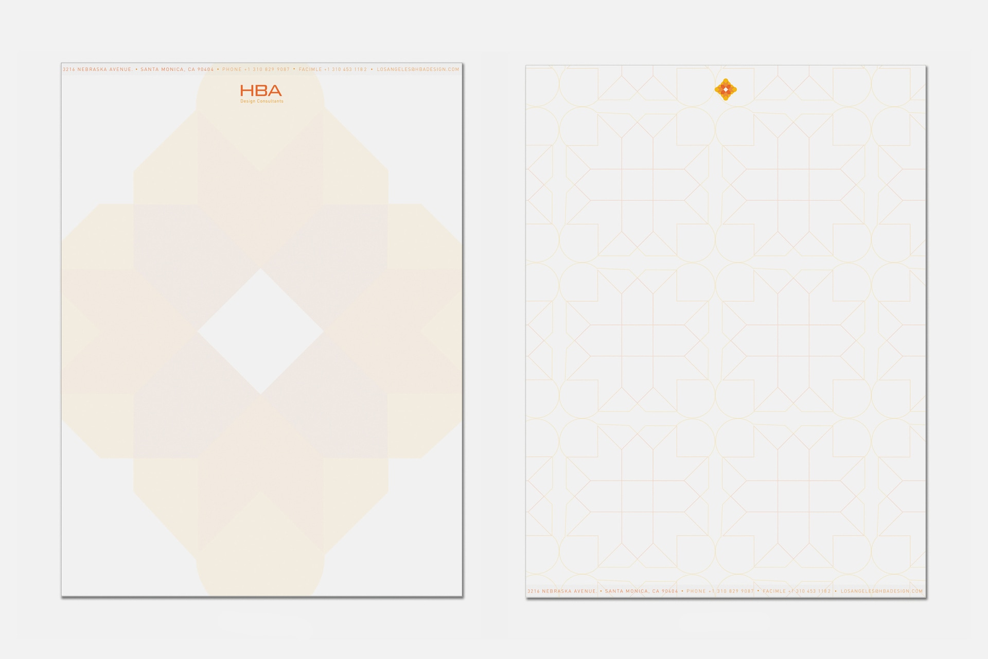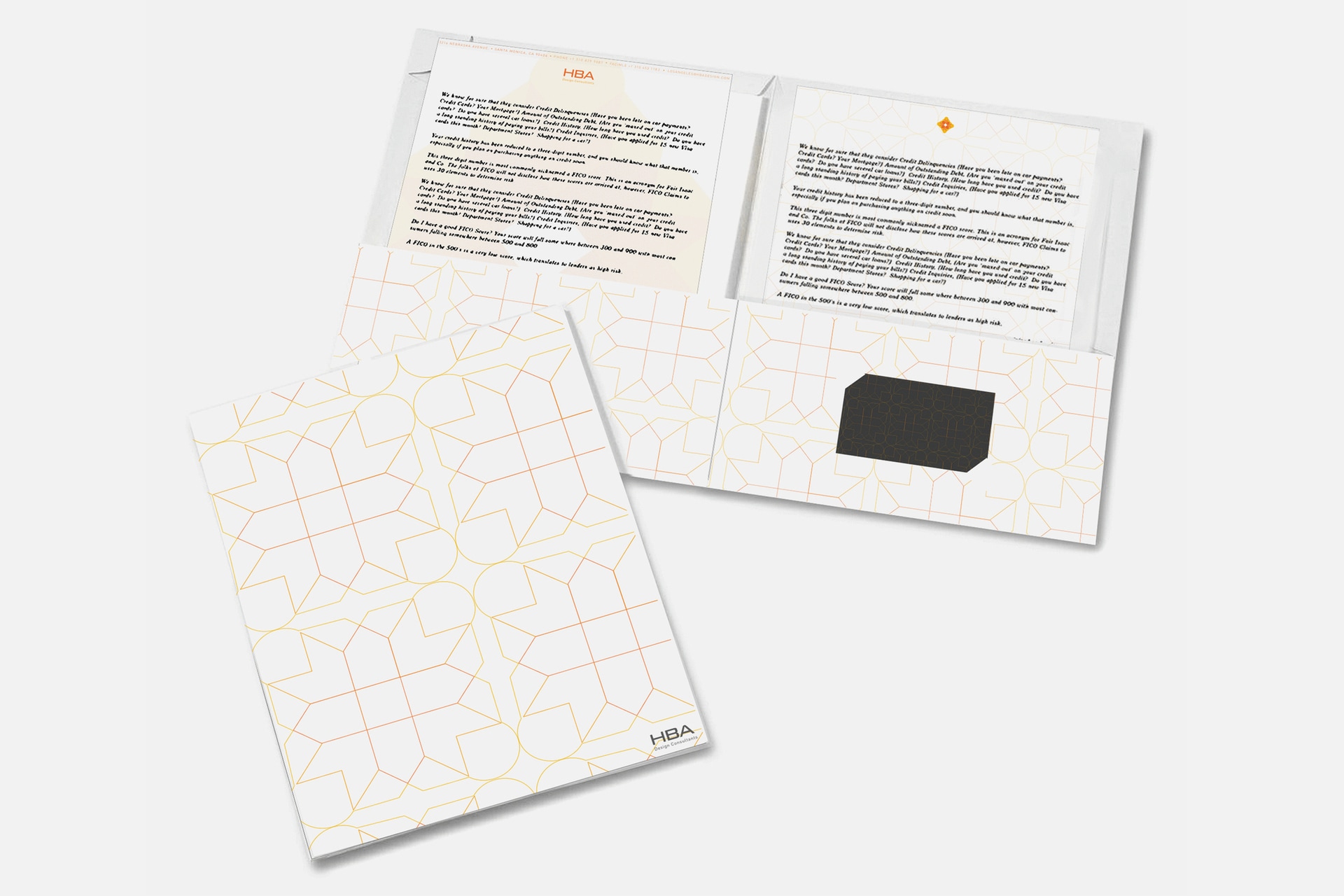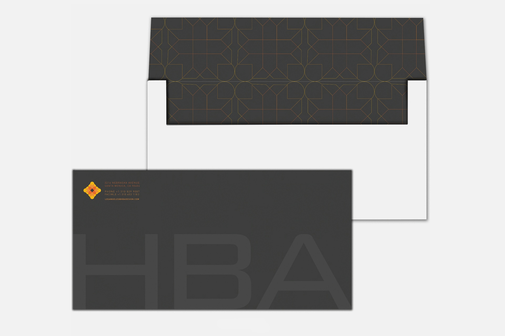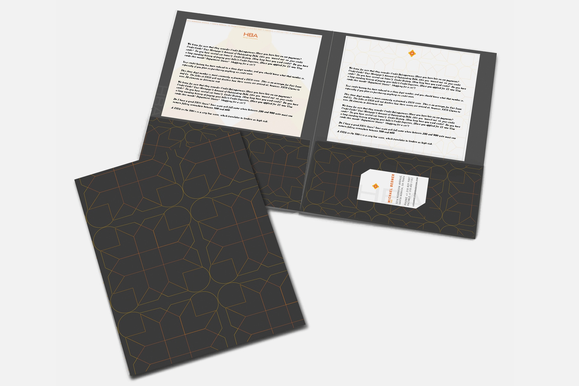These are folders, letterhead, envelope, and business card designs for HBA, an interior decorating company.